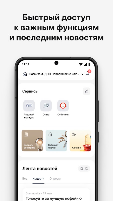The official mobile application for residents of the Novorizhskie Klyuchi village. With this app, you can pay bills, take part in surveys and general meetings, and receive important notifications and news.