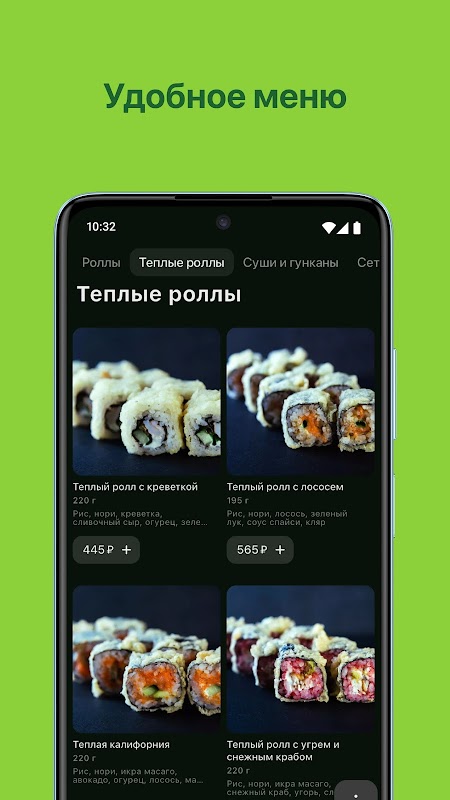 The menu has a large selection of rolls, sushi, pizza, salads, soups, hot dishes, drinks, as well as a children's menu.