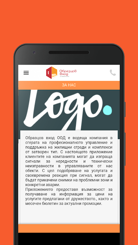 Образцов вход ООД е водеща компания в сгерата на професионалното управление и поддръжка на жилищни сгради и комплекси от затворен тип. С настоящото приложение клиентите на компанията могат да изпраща сигнали за нередности и технически неизправности в управляваните от нас обекти. С цел подобряване на услугата и своевремена реакция при сигнал, могат да бъдат прикачени снимки на проблемни зони и конкретни аварии.