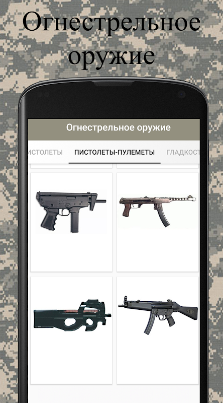 Catalog of firearms. Here you will find complete information about any type of firearms and small arms, not only Russian models but also from abroad. Rifles, carbines, pistols, revolvers, smoothbore weapons, submachine guns (pp) and much more you will find in this application.