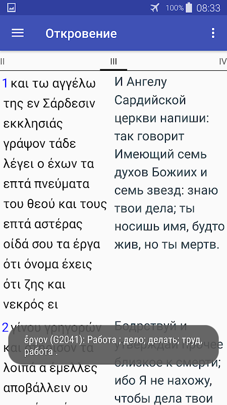 Parallel Greek / Russian Bible with the dictionary definitions for each Greek word. Translation Russian Synod 1876 is used for the New and the Old Testament.