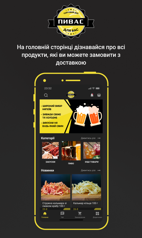 The "Beer for You" application is the most convenient and fastest way to order beer and snacks in Zhovti Vody! Install the application and get online access to our delivery service anytime, anywhere.
