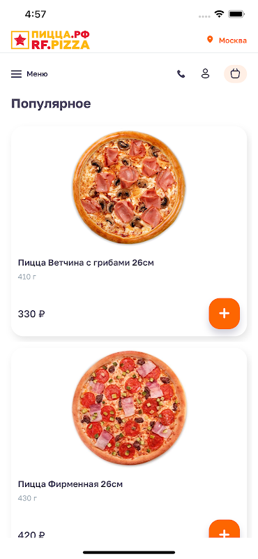 Using the Pizza.RF application, you can create online orders, monitor the status of orders, receive information about current offers and promotions