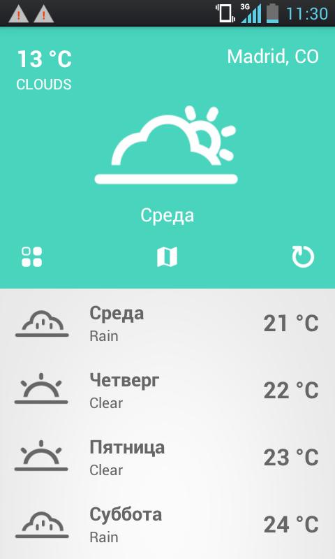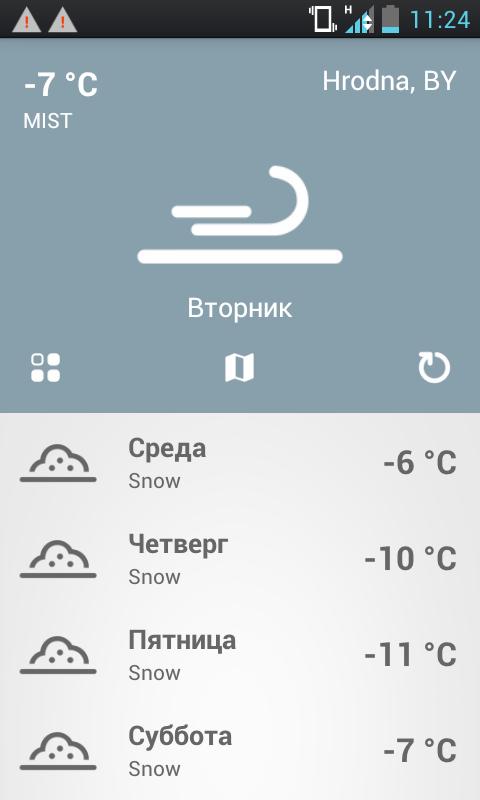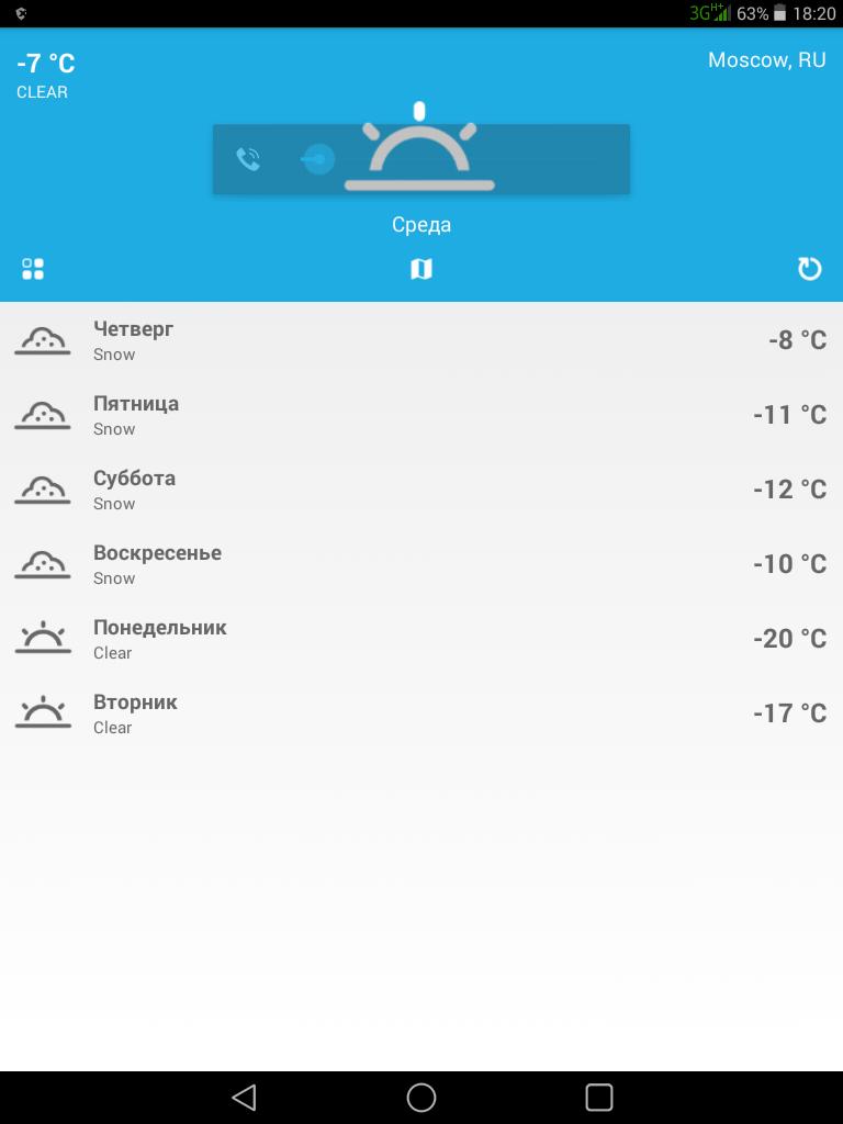 Внимание: после первой загрузки приложения необходимо нажать на иконку обновления данных, чтобы на экране Вашего смартфона или планшета отобразилась погода именно Вашего города!
