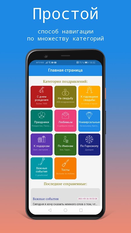 You will be ready for any holiday or event, because a huge database of congratulations will be on your phone always at hand! \