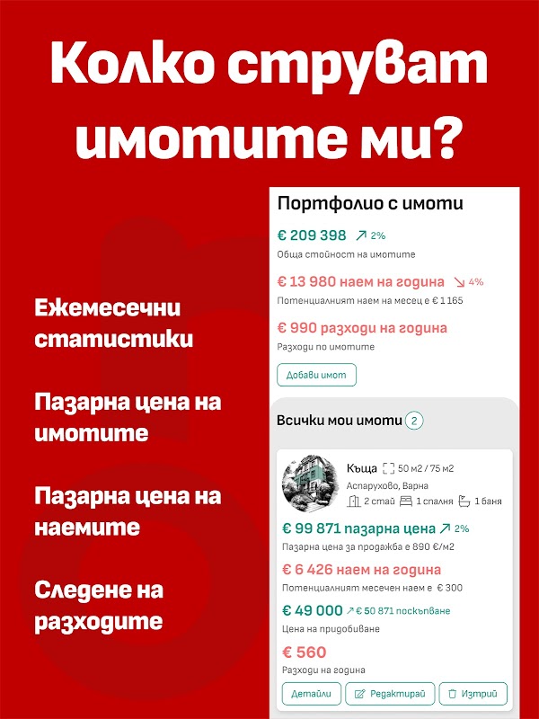 The "Portfolio" application from Realistimo is your indispensable assistant in real estate management. It gives you the opportunity to monitor the value of your properties, get informed about the market and make the right decisions based on accurate data and forecasts. Find out how much you have to pay for your apartment or house, what is the possible rent for the property (if you decide to rent it out in the future) and find out every month what the market value of the property is based on real estate listings on Realistimo.com
