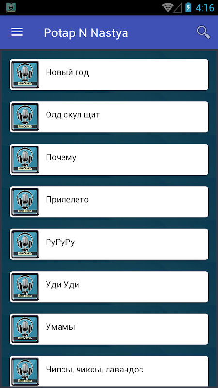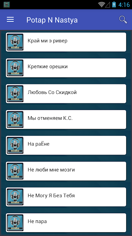 Одна из самых забавных вещей в мире - слушать музыку. музыка может сделать ваш день более ярким и веселым. С помощью этого приложения для потоковой музыки вы можете слушать музыку Потап и Настя, в которой есть веселая лирика и ритмы. очень подходит для тех из вас, кто боготворит Время N Стекло. Это приложение предоставляет только потоковое mp3-музыку. Каждый день и каждый раз, где бы вы ни были, вы можете послушать mp3 Потап и Настя, который вы хотите услышать.