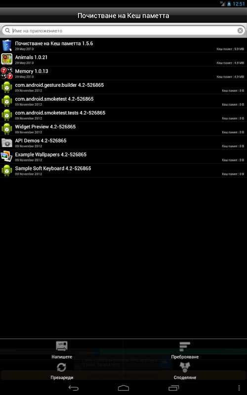 - Показване размера на всички приложения от списъка, които заемат място в Кеш паметта
