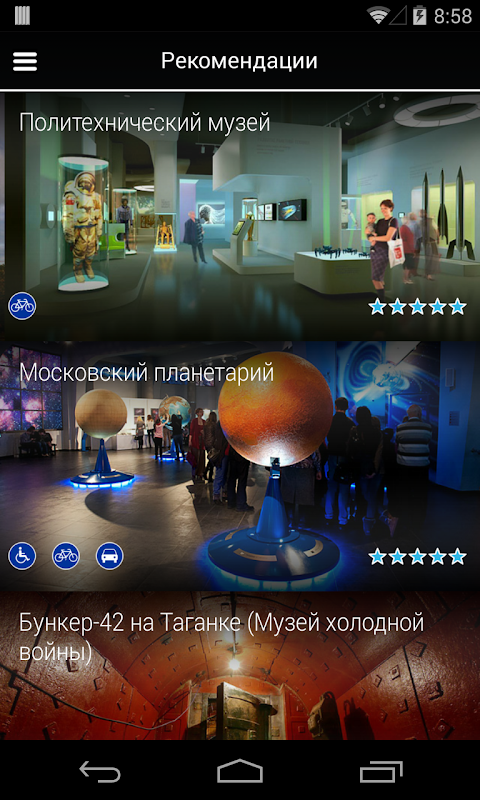 Если вы в Москве первый раз, это не проблема! Приложение порекомендует популярные музеи или расскажет, что есть по соседству. Не откладывайте культуру на завтра, отправляйтесь в музей прямо сейчас!