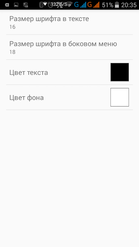 Application features: search, bookmarks, size settings, font color and background.