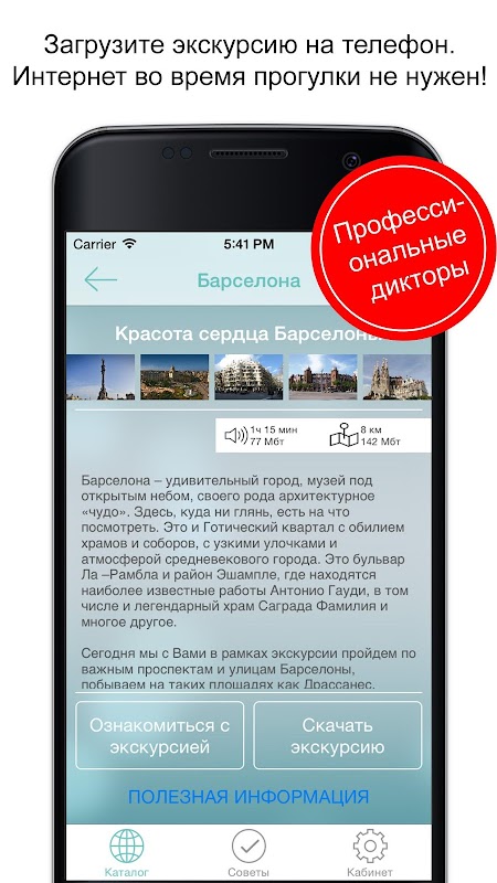 + Going on a trip, choose a tour that would like to visit. Pumped selected tour. That's all! Now you can walk along the route, listen to all the most interesting information about your place of residence, see photos and historical materials, to use the card. Guided tour - just a couple of dollars. And you do not need an internet connection during the tour.