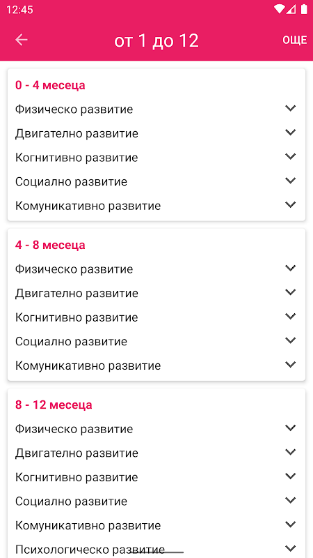 Програмата проследява възрастта на детето и текущото му развитие. Тя дава информация за развитието на детето от раждането до 12 годишна възраст. Чрез нея ще можете да проследите: