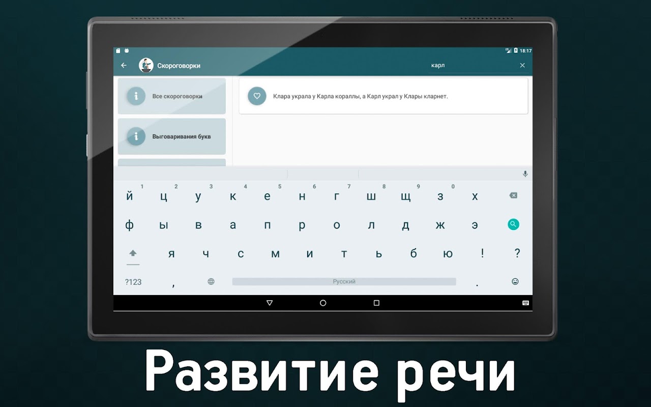 In the application "The development of speech. Skorogovory", collected 500 popular patters, divided into categories, where you can choose certain letters that you want to learn to pronounce correctly.