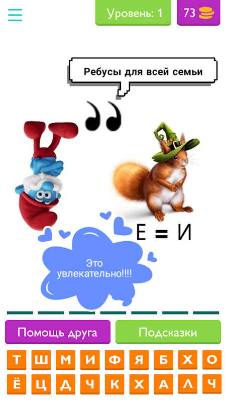 Увлекательное приложение Ребусы для всей семьи - отличный способ провести свободную минуту в любом месте: в транспорте, в очереди или сидя за столиком в кафе. Викторина построена по принципу шоу Поле Чудес и подразумевает отгадывание слов - ребусы, шарады, головоломки. К услугам пользователя подсказки, кнопка Помощь Друзей и деньги, используя которые можно показать одну из букв или перейти на следующий уровень, чтобы отгадывать другие ребусы, шарады и головоломки.