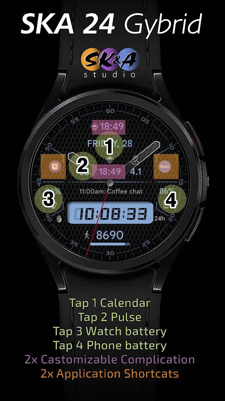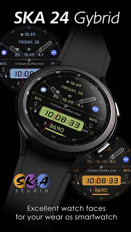 This watch face supports all Wear OS devices with API Level 30+ like Samsung Galaxy Watch 4, 5, 6, Pixel Watch etc.