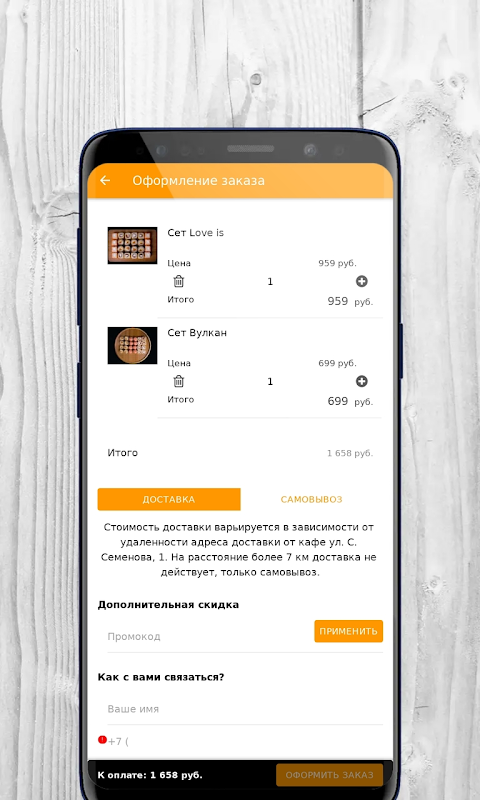 Через приложение Вы можете оформить самовывоз, а также заказать доставку на дом и в офис: