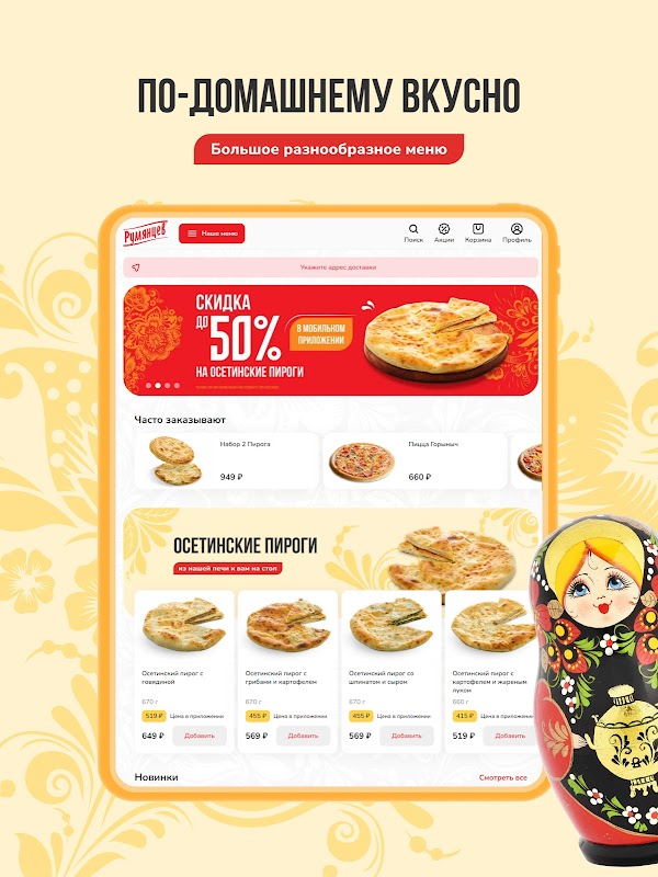 The Rumyantsev company is a delivery service for delicious and always fresh baked goods, pizza, hot dishes, salads and drinks.