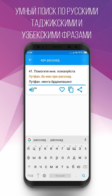 Phrasebook is a great assistant for those who know Russian / Tajik / Uzbek, and an indispensable companion for everyone who is just starting to learn the language. The phrasebook works completely without an internet connection.