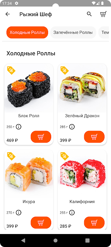 В мобильном приложении Рыжий шеф, доставка суши и роллов, доставка пицц.