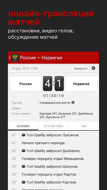 The Russian national ice hockey team from Sports.ru for Android is a new application about the Russian national team that allows the fan to always be aware of what is happening in their favorite team. Application includes: