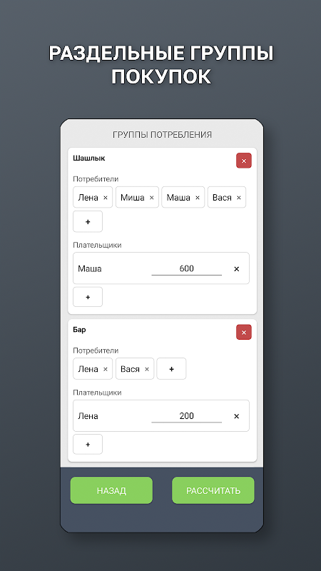 The application allows you to equally distribute the total expenses of participants in a joint event.