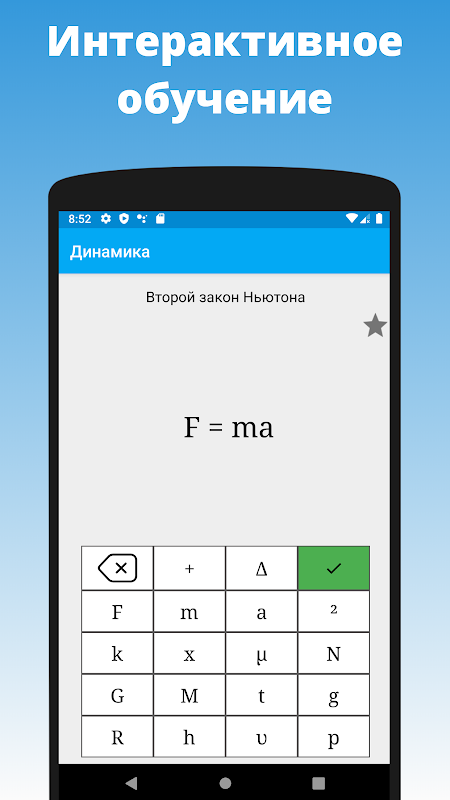 Make the right formulas and soon you will know them perfectly! Tests in this application are suitable for those who pass the exam, exam, ZNO, CT or GIA in physics. If you cannot remember certain formulas for a long time, then add them to your favorites and take the test using problematic formulas.