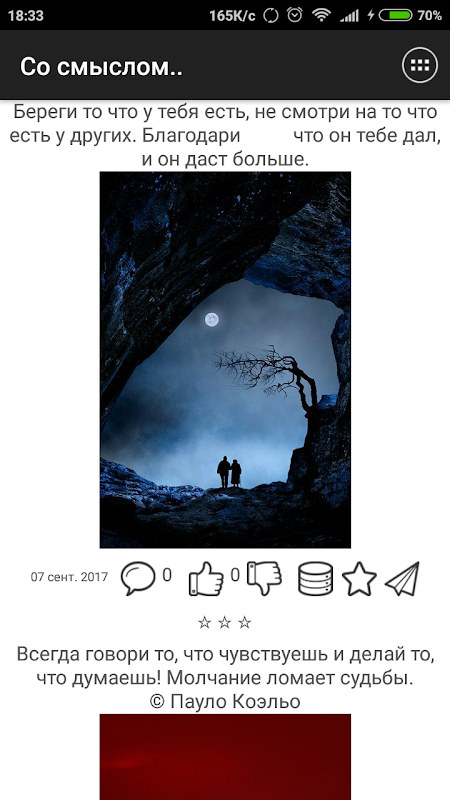 Вас интересуют приложения, в которых вы можете прочитать цитаты или факты, которые заставляют задуматься? Вам крупно повезло! "Со смыслом" - то, что вам надо! Удобный интерфейс - ничего лишнего. Здесь находится огромное количество интересных фактов, цитаты великих людей и просто цитаты, разных мыслей и истинных ситуаций. Наша коллекция интересных фактов, историй, мыслей и т.д. обновляется ежедневно. Так что заходи и начинай развиваться.😉