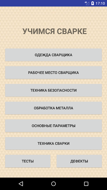 Mobile application "Welding Handbook" developed for technological support of the educational process and is an electronic guide to the academic subject "Spetstechnology" specialty "Welding Technology." This application can be regarded as one and the methodological tools in the work of the teacher, which allows to organize the visual, content and information-rich training sessions.