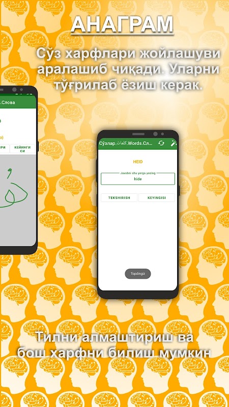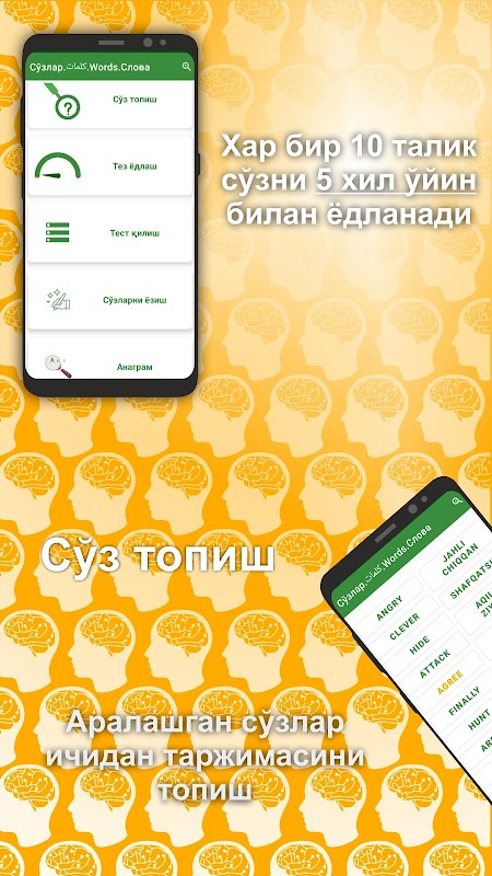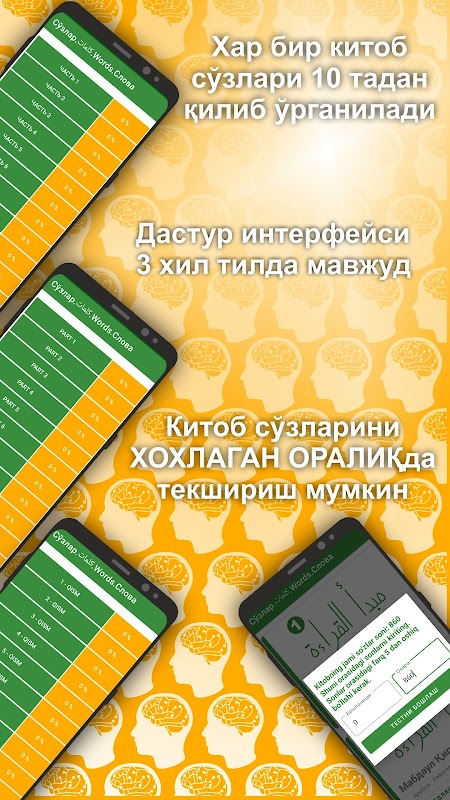 Dastur khar bir kitob sozlarini 10 tadan qilib yodlatadi. Shu 10 ta sўzni 5 khil usulda Ainab yodlash imkonini beradi.
