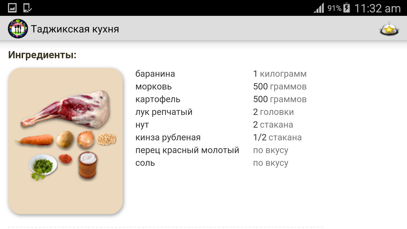 Это приложение для любителей таджикских блюд. Рецепты разных категорий, способы приготовление в графическом и в текстовом виде. Вкус таджикских блюд невозможно описать словами, надо их приготовить и попробовать, попробуйте и вы. Живите красиво, кушайте вкусно )))