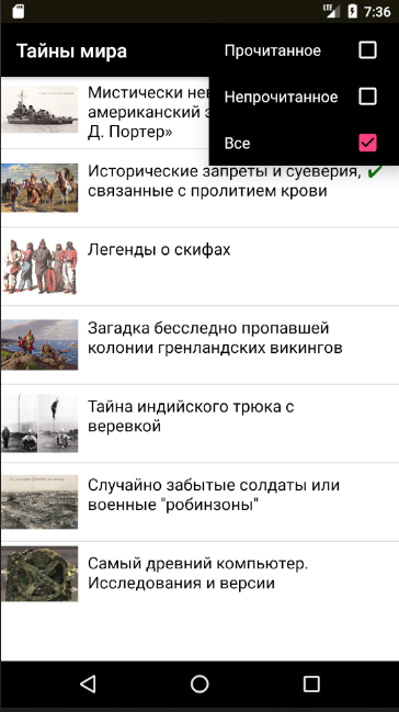 После прочтения статьи автоматически отмечаются прочитанными, можно фильтровать статьи в списке и отображать "Все", только "Прочитанные" или "Непрочитанные" статьи.Есть возможность найти статью по заголовку.