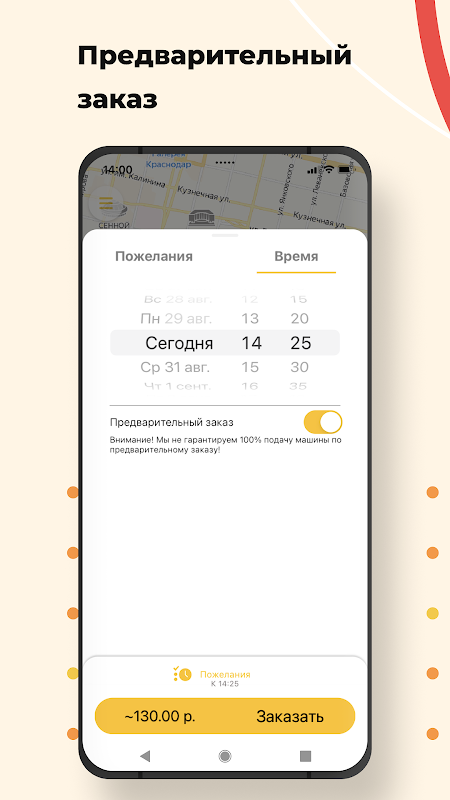 Need a car by a specific time and date? Order it in advance through the application, and at the appointed time, a taxi will be waiting for you at the entrance.
