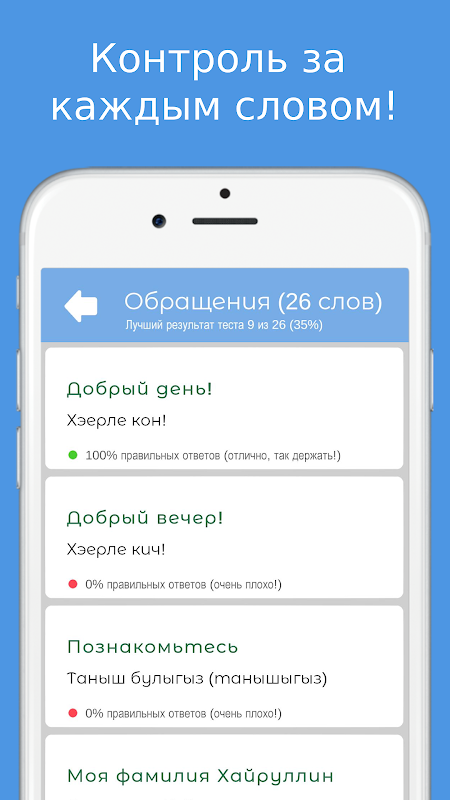 The Russian-Tatar phrasebook allows you to learn the Tatar language using tests.