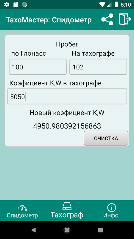 Программа создана для тахографных мастерских для расчета коэффициента B6, B7 спидометра в тахографе.