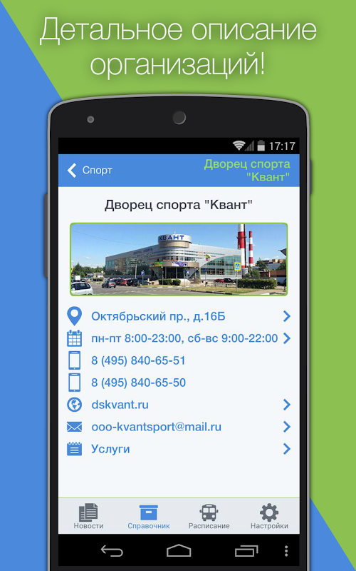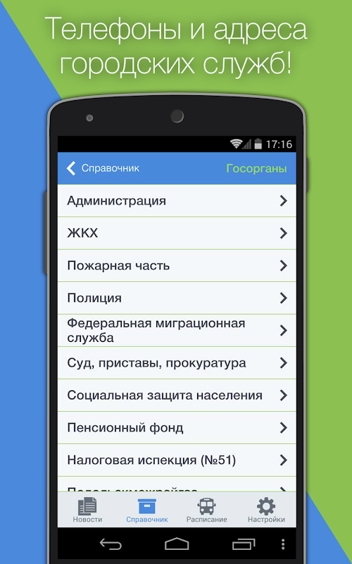 В приложении есть и контакты городских организаций. Справочник постоянно пополняется. В нем Вы найдете телефоны, адреса и графики работы управляющих компаний, участковых пунктов полиции, автоперевозчиков и т.п. Если Вы застряли в лифте, пригодится специальный раздел "Экстренное" - в нем собраны контакты "Лифтека". Здесь же - телефоны круглосуточной аптеки, ветклиники, травмпункта и т.д.