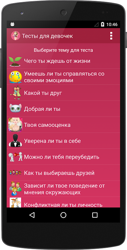 Лучший сборник бесплатных тестов для девочек. Пройдите тесты и узнайте о своих сильных и слабых сторонах. Здесь собраны самые распространенные темы: тест на характер, на личность, на любовь, на совместимость, на влюбленность и т.д.