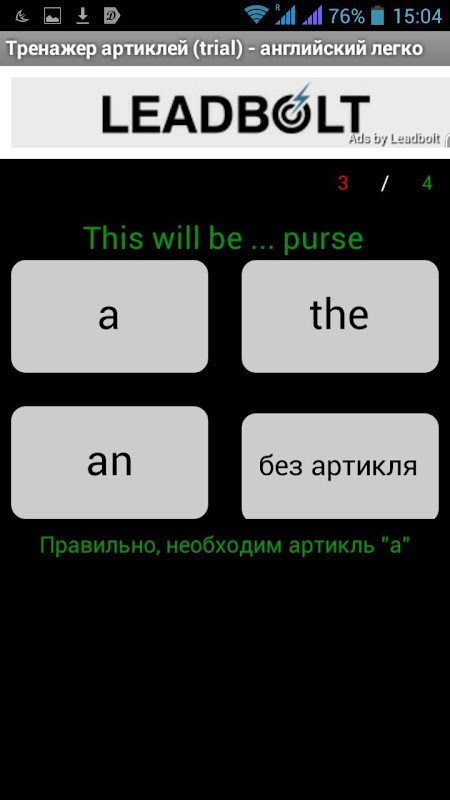 Если Вы правильно отвечаете на задание относительно применения артиклей в английском языке приложение предлагает следующее задание, если неправильно, приложение покажет правило, которое необходимо применить.