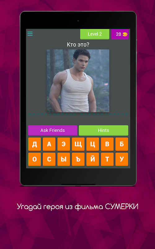 Викторина по всеми известному фильму Сумерки. В которой вам нужно будет угадать героев. В игре взяты не все персонажи. На данный момент 37 уровней. Остальные будут добавляться поэтапно.