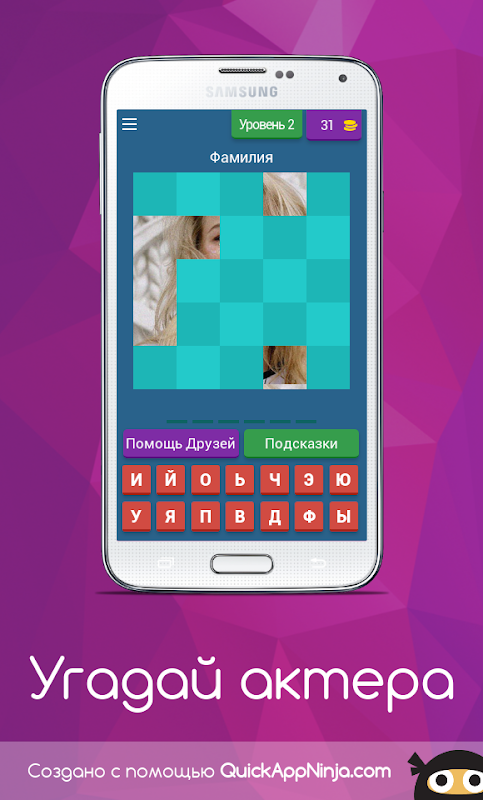 Угадай российского актера - это классическая андройд-викторина, в которой тебе предстоит угадать знаменитых актеров по фотографии. Фотографии актеров скрыты за плитками. Постарайся угадать фамилию актера, открыв как можно меньше плиток. Чем меньше плиток ты открываешь, тем больше монет получаешь.