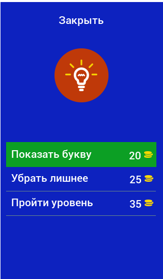 -Если Вы не знаете ответ, не расстраивайтесь, воспользуйтесь подсказками "показать букву", "убрать лишнее", либо "пройти уровень".