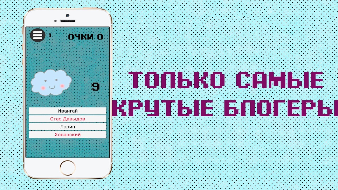 Добро пожаловать в самое крутое приложение про блогеров! Вам предстоит сразиться с весёлым облачком и угадать самых известных видеоблогеров России и Украины!