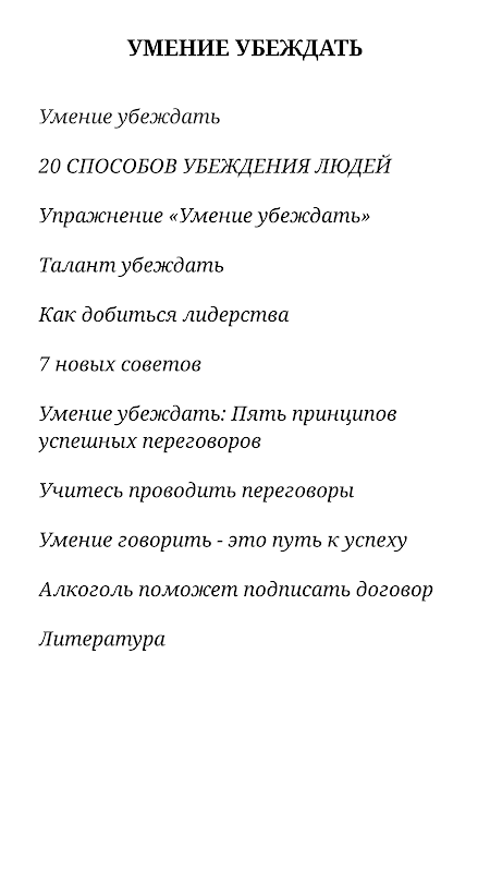 Умение убеждать - это залог успеха во всех делах. Многие из нас не знают, как правильно вести диалог, как быстро продать товар, как воздействовать на аппонента, чтобы он принял твою точку зрения. Благодаря этому приложению Вы сможете окунуться в новый мир, в котором можно стать победителем. Практические советы, полезная информация литература, обновляемые статьи - помогут вам приобрести умение убеждать, без которого не обходится ни одна сфера нашей жизни.