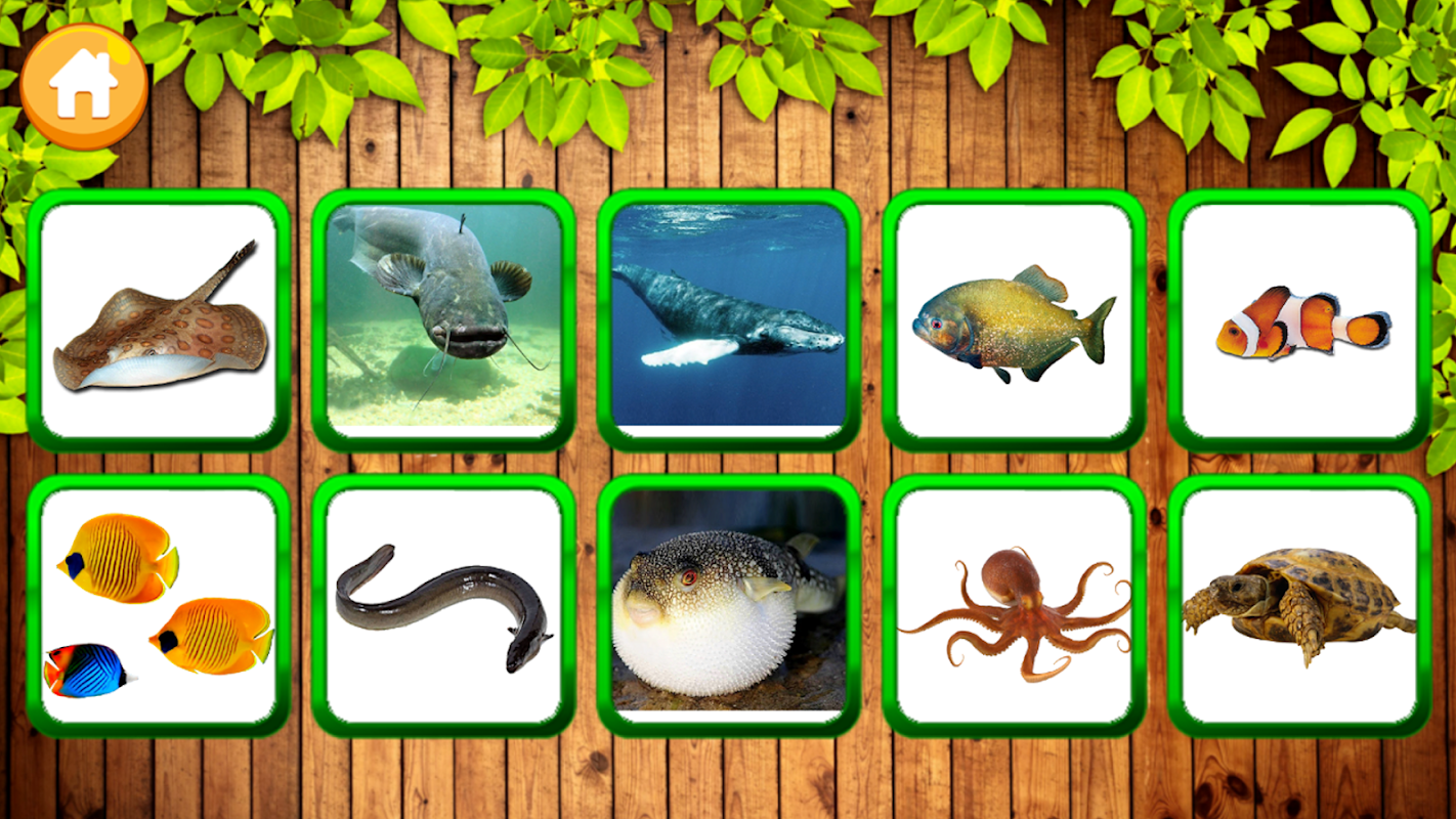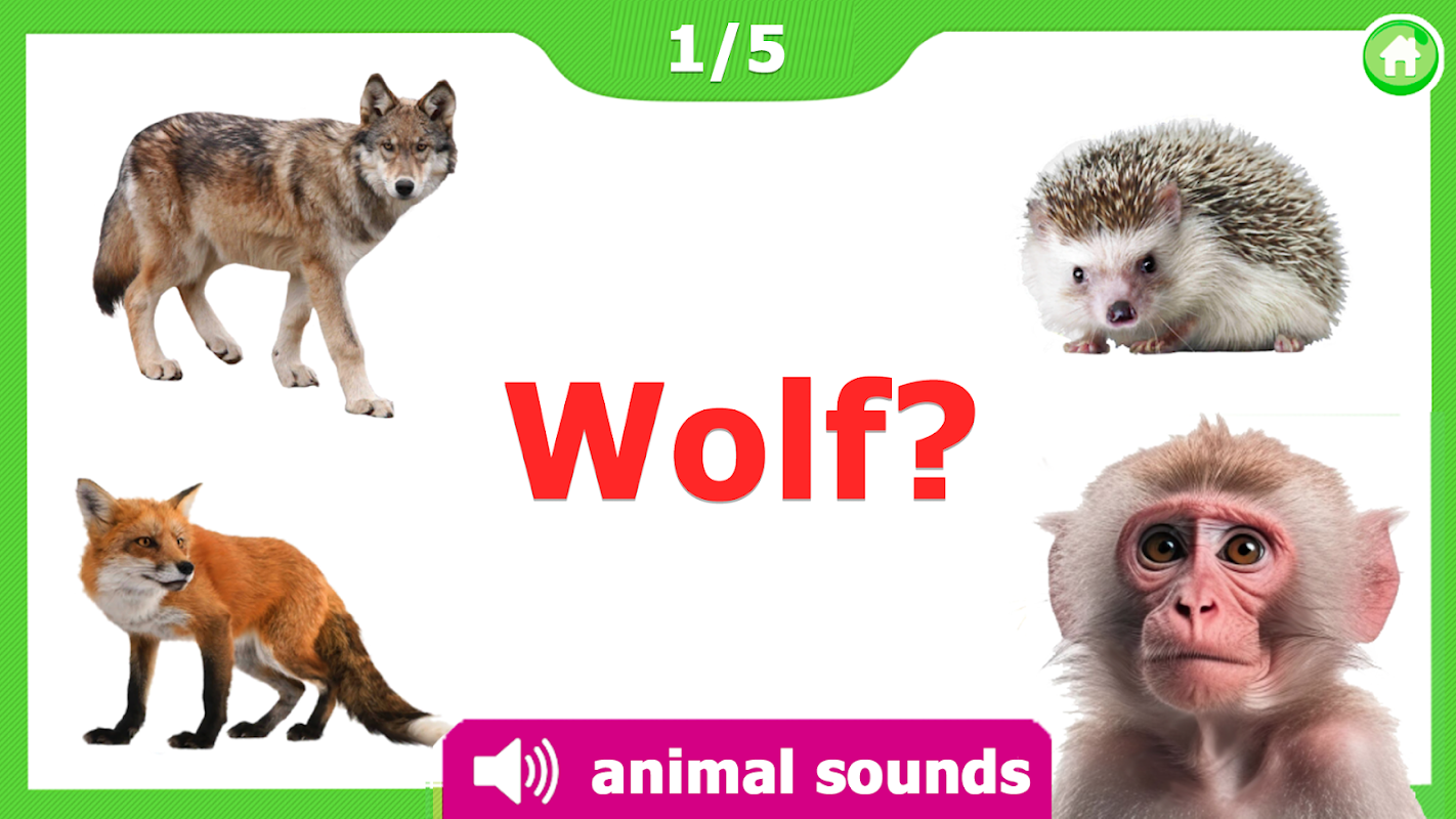 The game is completely free! Beautiful animal photos and amazing sounds. It includes 3 sections: domestic animals, African animals, forest animals, birds, insects, and fish. There are three games: learn animals, find the card, and match the pairs.