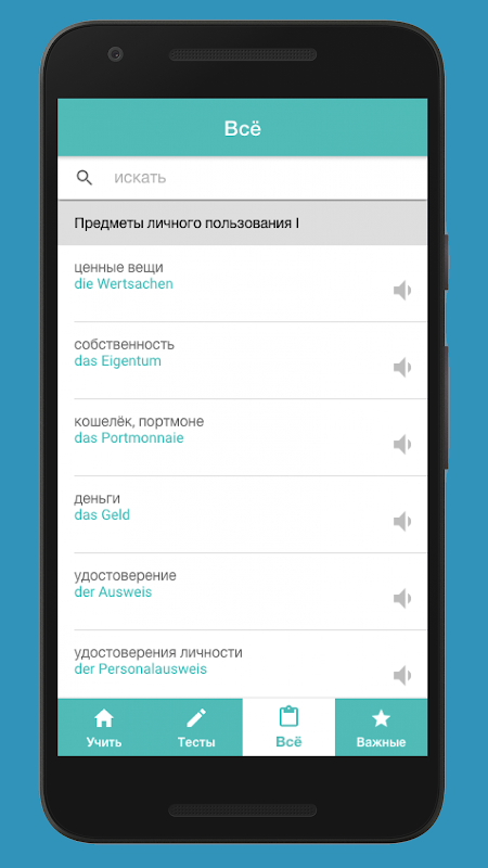 Это замечательное приложение "Учить немецкий бесплатно" позволит изучать немецкий алфавит, новые немецкий слова, фразы на немецком для повседневных ситуаций совершенно бесплатно.