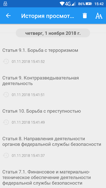 - Просмотр текста закона в виде удобного перелистывания статей, возможностью копирования выделенного фрагмента, поиска по тексту