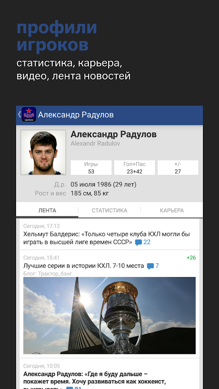 • Текстовые трансляции матчей, календарь и таблица КХЛ;