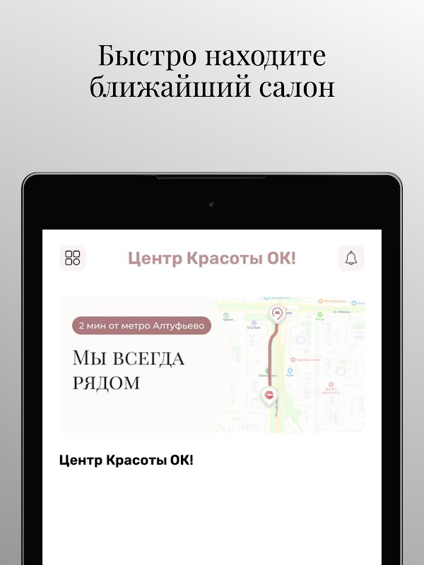 Our mobile application for you is your personal account in the beauty salon. You can sign up for our salon online (at any time convenient for you), and you will be kept up to date with the events of the salon (news/promotions).
