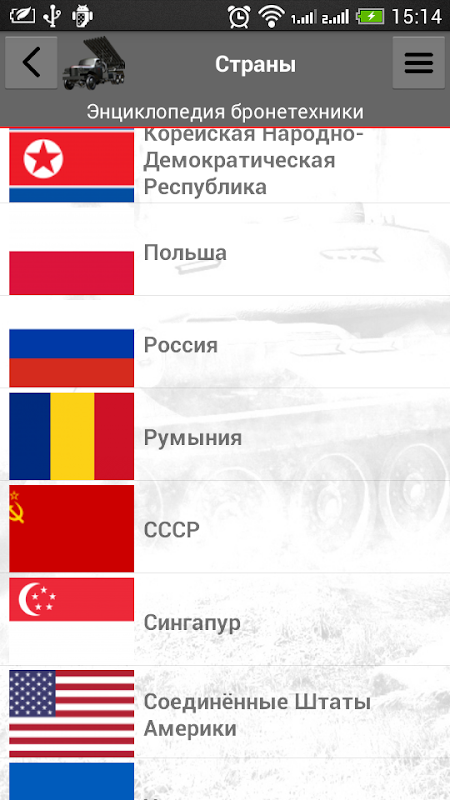 Приложение представляет собой большой справочник по военной бронетехники. В справочнике представлены танки и военная техника следующих стран: Австралия, Австрия, Аргентина, Белоруссия, Бразилия, Великобритания, Венгрия, Германия, Египет, Израиль, Индия, Италия, Китайская Народная Республика, Колумбия, Корейская Народно-Демократическая Республика, Польша, Россия, Румыния, СССР, Сингапур, Соединённые Штаты Америки, Украина, Франция, Чехословакия, Южно-Африканская Республика, Япония.