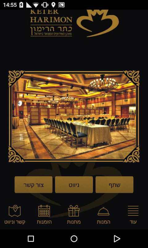כתר הרימון הינו מרכז האירועים המפואר בישראל. האולם המזכיר במראהו היכל בסגנון אירופי - קלאסי, מתגאה בהכשר - גלאט כשר ברמה הגבוהה ביותר (של הרב לנדא), המאפשר לקהל הדתי-חרדי לחגוג באולם את שמחותיו. לאולם גן צמוד רחב מימדים ויפהפה, המאפשר לחגוג את החופה גם מתחת לכיפת השמים.