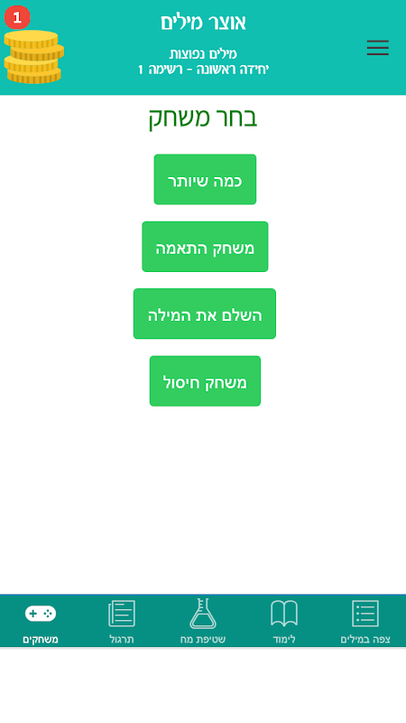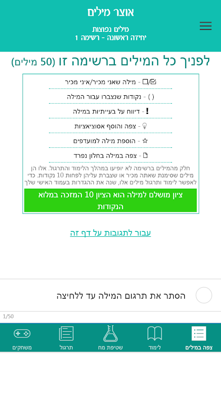 Our system includes the common words in the language, sorted, along with other useful words in the language and enables smart learning so that your vocabulary will gradually improve until success! Our vocabulary system allows saving words that are difficult for you, saving words that you got wrong a lot, associations added by community members, progress meter, games, and much more